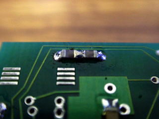 その後、2個のチップコンデンサの間をはんだ付けします。その際に基板上のホール(セラロック用の中央の穴)にもはんだが付着するように注意します。