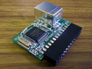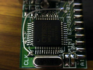 (EZ-USBは基板に両面テープで接着されています。基板からはがす時にチップのピンを曲げないように、先の細いもので慎重にはがしてください。ピンを曲げてしまった場合はルーペなどで確認しながら整形してください。)