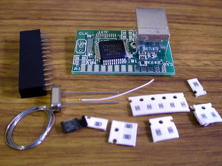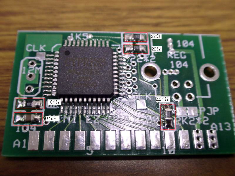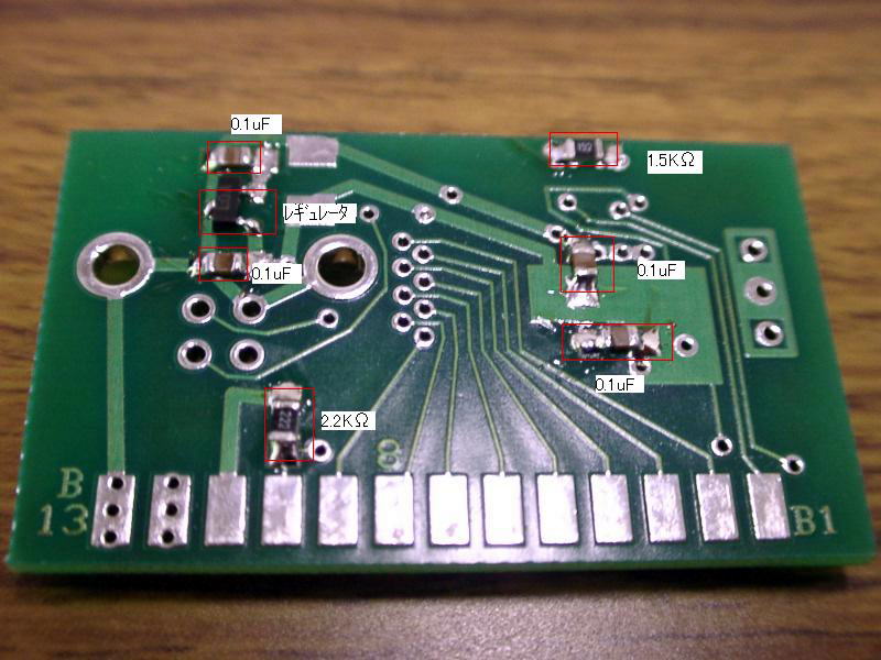 順序としてはAN2131SC、チップ抵抗・コンデンサ、クリスタル、コネクタの順番になります。