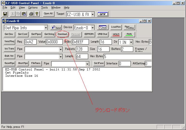 次に実際にEZ-USBにプログラム(ファームウエア:FW)をダウンロードして実行させ、USB経由でテストデータをPC