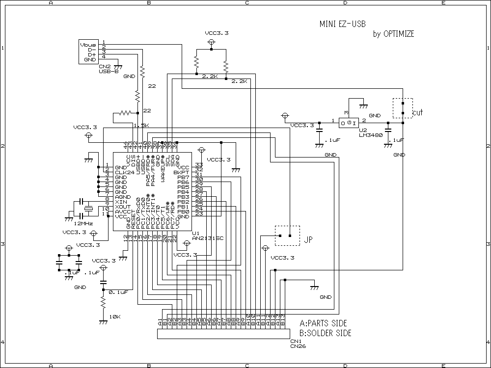 ごく普通のEZ-USBの回路です。EZ-USBから出力可能な24MHzのクロックは基板のスペースの関係上コネクタと接続されておりません。必要に応じて基板上の2箇所のCLKと書かれているランドを結線してください。
